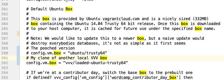 This is an important step. Especially when the default Ubuntu/Trusty64 package is pooched thanks to a down PHP repo for the apt-get commands that will run. The hack is easy, edit the Vagrantfile that was just cloned into the directory and change the config.vm.boxname